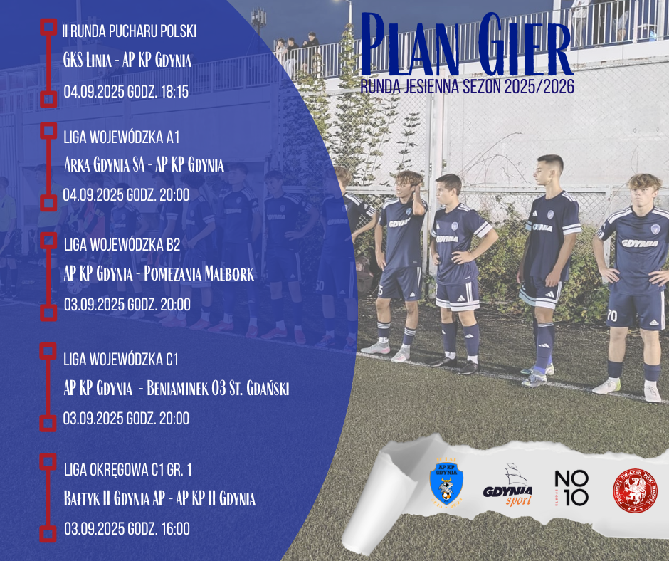W środę zagramy trzy spotkania, rocznik 2010 podejmie Pomezanię Malbork, natomiast rocznik 2011 zagra z Beniaminkiem 03 Starogard Gdański. Druga drużyna trampkarzy starszych spotka się z Bałtykiem II. W czwartek juniorzy starsi zmierzą się na Witominie z Arką Gdynia.